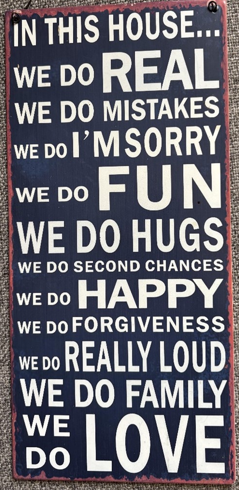 Have you noticed WE DO FAMILY, WE DO LOVE lie at the bottom of the list, have you noticed all these words are in capital letters and have you noticed LOVE is the largest word on the sign? Is this because love encompasses all that has been written or is it because, as I heard the other morning, LOVE must be in all we do and say? – probably both.