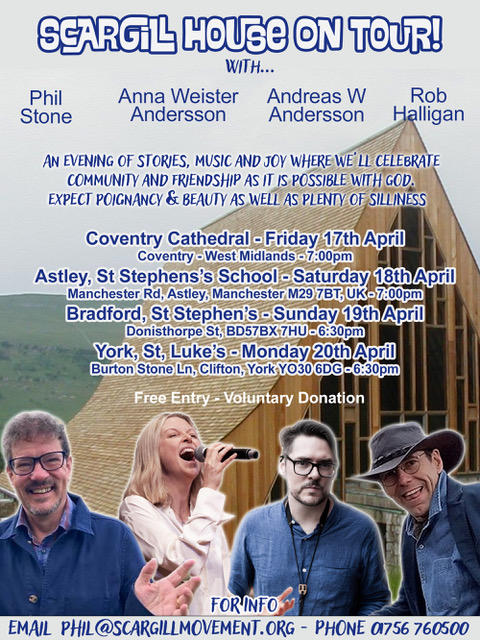 Next, we are pleased to announce a Scargill Tour running Friday 17th to Monday 20th April which involves Rob Halligan (songwriter musician), Andreas and Anna Weister-Andersson (musicians and former Community members) and myself (Phil Stone). The Tour is an opportunity to share something of the life of Scargill through song, conversation and laughter. Each of the evenings are free entry with a voluntary donation, The Tour dates are in Coventry, Greater Manchester, Bradford and York. See the poster for timings and venues information. Please do share the poster and information widely – spread the word! We very much look forward to catching up with some of you at what should be enjoyable and fun evenings together.